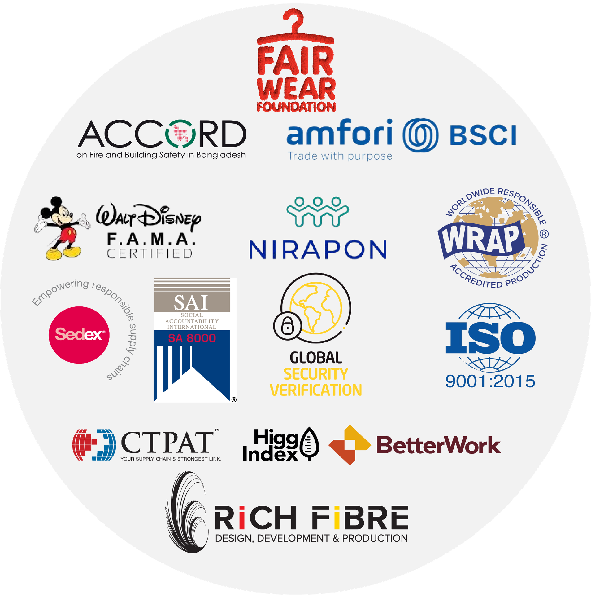 Manufacturing facilities under RICH FIBRE LTD. are engineered based on global bench-marked compliance standards. All our facilities are audited and certified to be compliant with the strictest social and environmental requirements and standards like ACCORD, NIRAPON, BSCI, WRAP, SEDEX, GOTS, BETTER WORK, DISNEY F.A.M.A., OCS, ICS, GTW, RTM, ZDHC, OEKO-TEX, JOIN LIFE, HIGG INDEX, BLUE SIGN, ISO, SAI, GSV and so on.